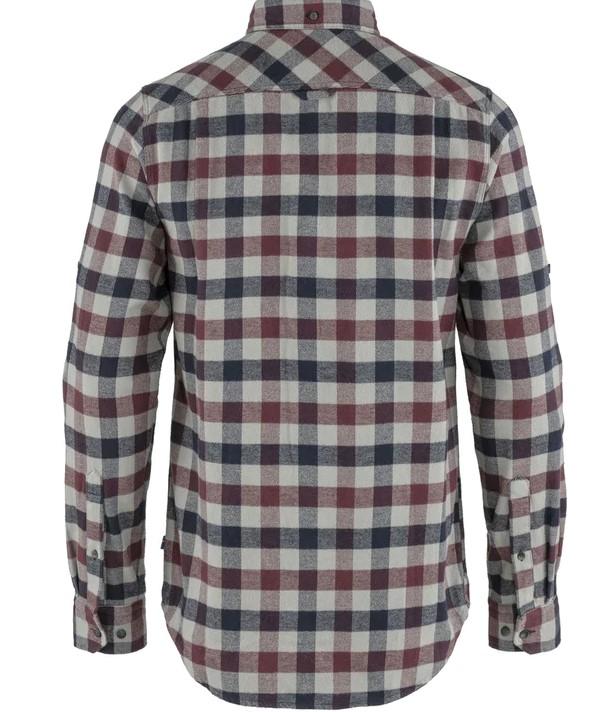 Camisa de uso diario de manga larga con corte ajustado en franela de algodón maravillosamente gruesa. Dos bolsillos de pecho con tapeta, botones y portabolígrafos. Cuello abotonado y botones para sujetar las mangas enrolladas.