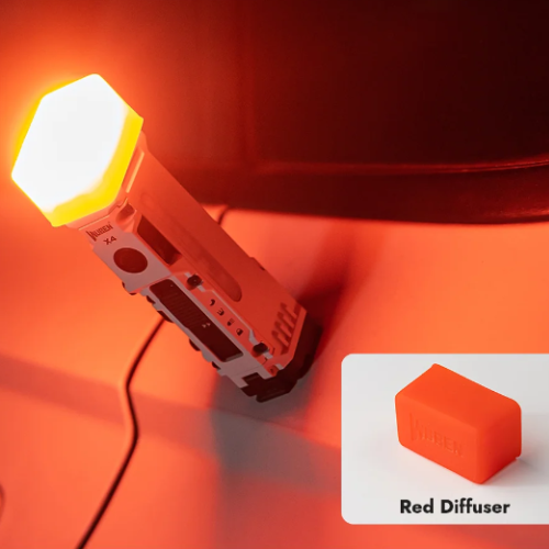 Difusor rojo diseñado para ampliar la funcionalidad de la linterna X4, ideal para señalización, preservación de la visión nocturna y uso en actividades outdoor, camping, fotografía nocturna o situaciones tácticas. Su diseño permite una colocación rápida y segura, transformando el haz de luz en una iluminación suave y uniforme.