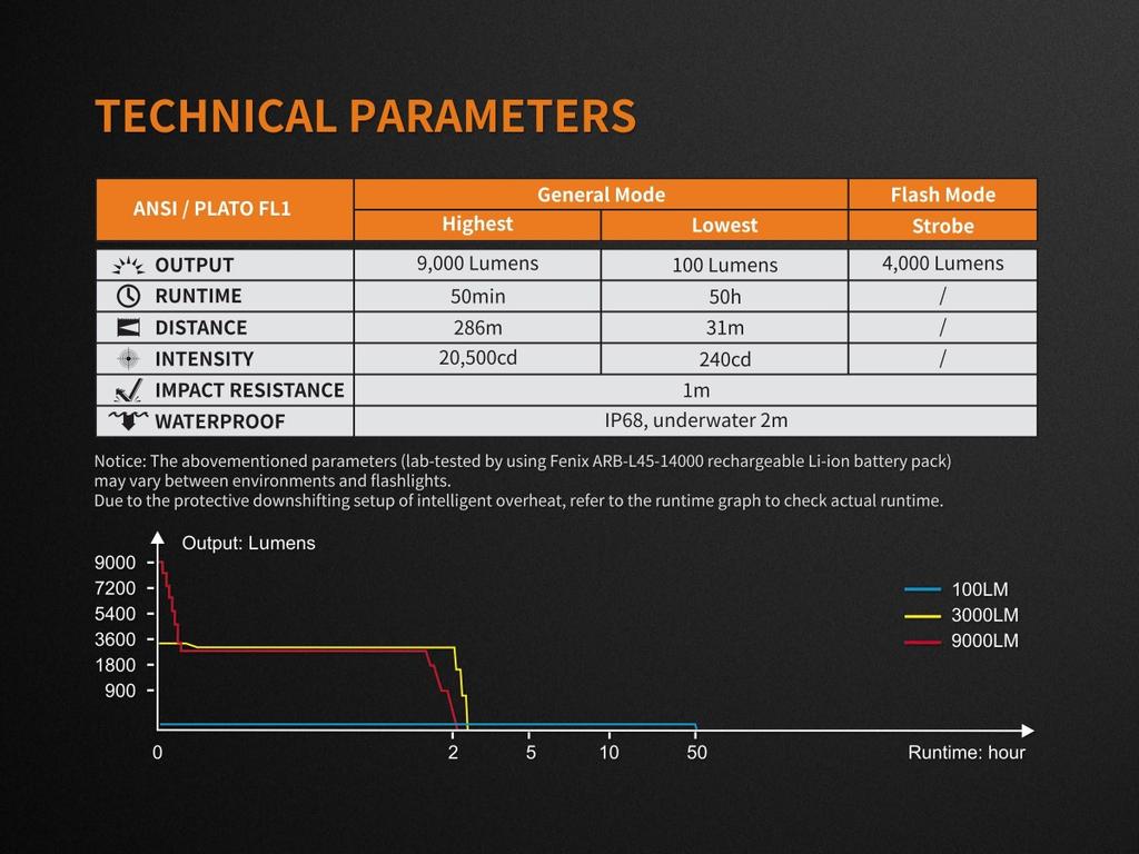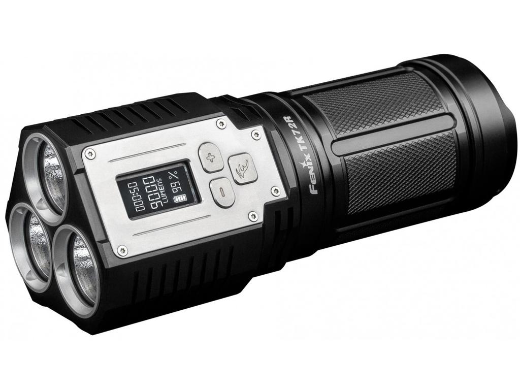 Linterna Fenix TK72R con 9000 lumenes. Ilumina a 286 metros de distancia. hasta 50 horas de duración con pack de baterias en modo 100 lumenes. 90 potencias de iluminacion (aumentos graduales de 100 lm) y 1 modos flash.